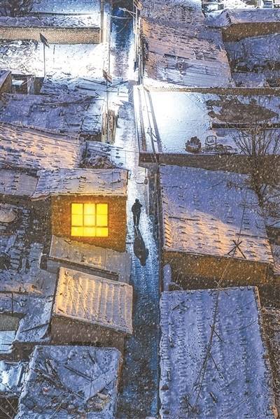 雪还在下,但巷口的街灯似乎比往常更亮了些。昏黄的光线透过飘落的雪花,洒在地面上,形成温柔的光晕。